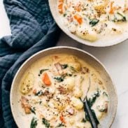 3. Unlike the wild rice soup, this chicken gnocchi soup is made thick by evaporated milk and a quick cornstarch slurry. So if you’re looking for thick and creamy soup while avoiding the butter/flour/cream route of a roux base, this is your magic. ✨