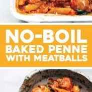 Keywords: baked penne, penne with meatballs, no boil penne